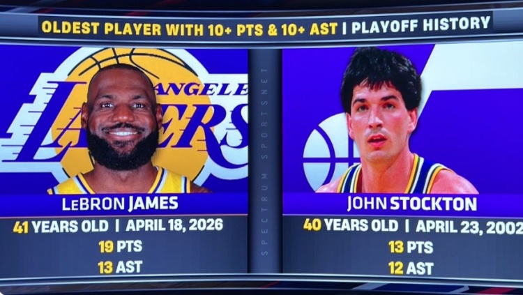 据统计,詹姆斯(41岁109天)得到得分助攻的两双,历史最老(此前纪录由斯托克顿保持)。